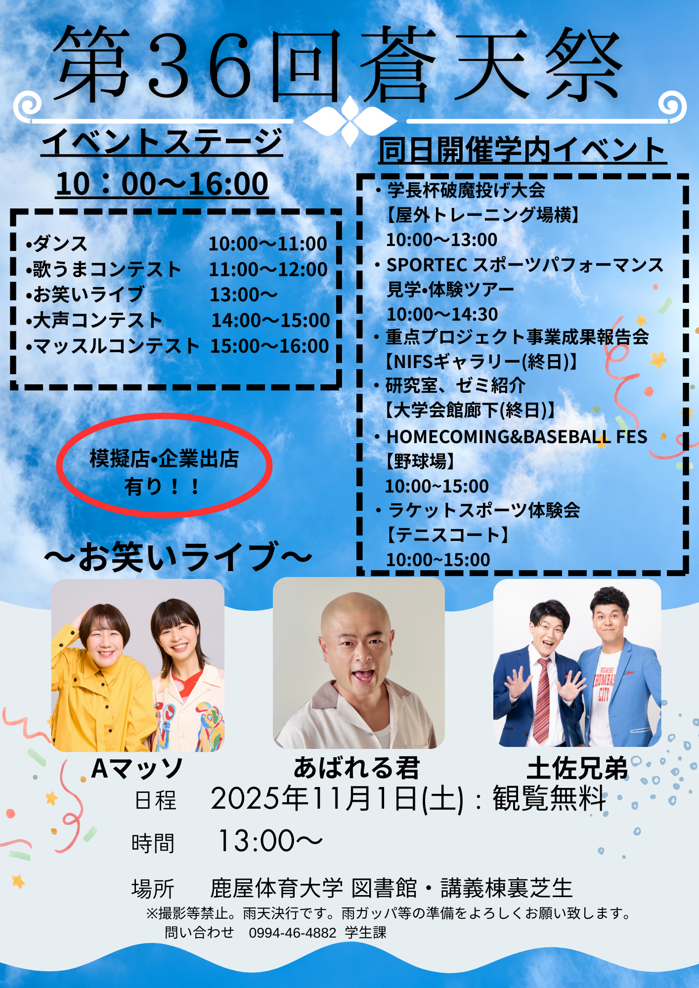 来たる11月1日(土)鹿屋体育大学にて学園祭「蒼天祭」が開催されます。本クラブでは会員の皆さまに日頃の感謝を込めて、蒼天祭の模擬店で使用できる300円分の優待券を会員特典として配付させていただきました。使用方法につきましては、下記の留意事項をご確認ください。皆さまのお越しをお待ちしております。